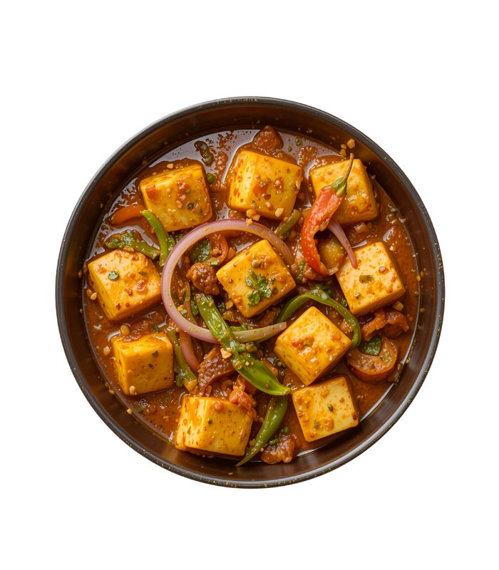 Kadhai Paneer features tender paneer cubes tossed with capsicum, onions, and freshly ground spices. Cooked in a thick tomato gravy, it offers bold flavors and a satisfying texture.