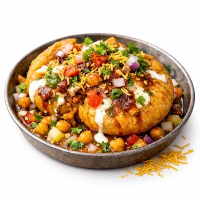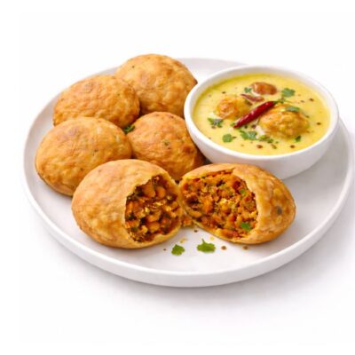 Traditional pyaaz kachori filled with spiced onions, crushed and topped with chilled yogurt, tangy chutneys, fresh herbs, and bold Indian spices. A flavorful and indulgent chaat experience.